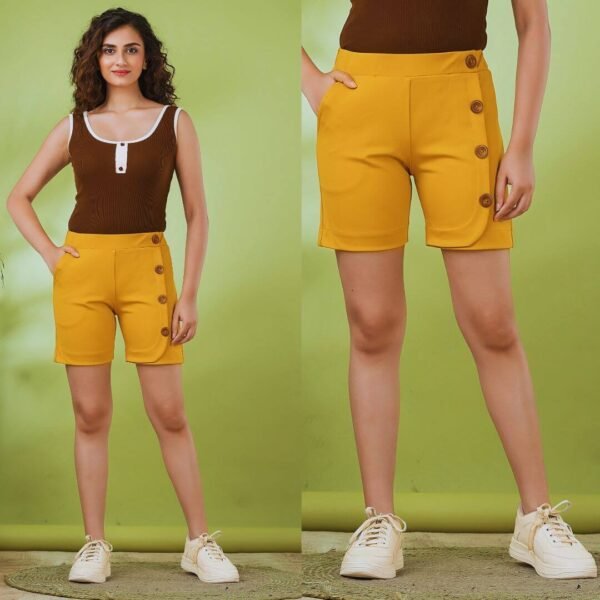 Chic Mustard Buttoned Ladies Hot Pant – Stylish Mid-Rise Casual Shorts